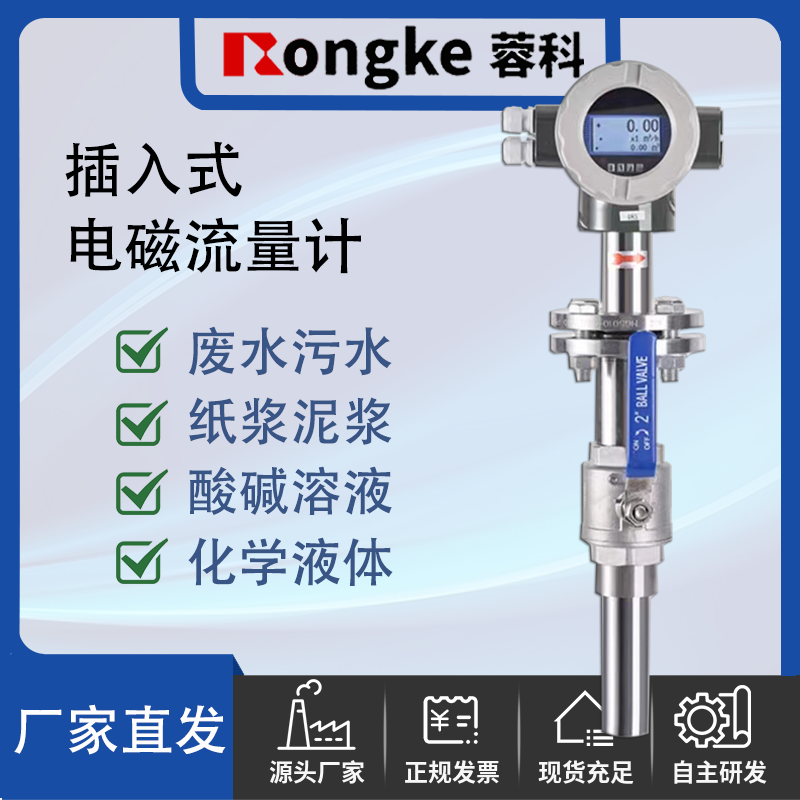 插入式电磁流量计可用于,污水测量、清水、海水测计量、化工厂酸碱测量、冶金行业液体计量等,广泛应用于各种恶劣环境测量。流量计标配4-20mA模拟输出,RS485通讯远传可读取数据,高清界面,直观反映流量大小。