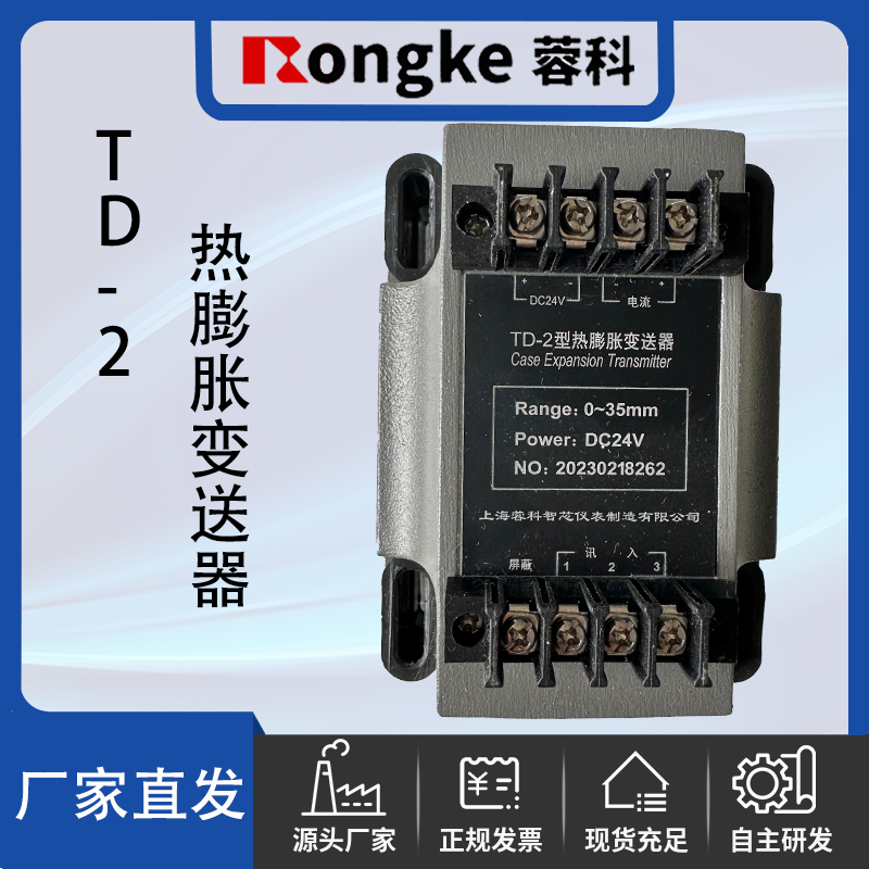 TD-2型热膨胀变送器.蓉科Rongke是针对电感位移传感器而设计的产由振荡器、桥式检波器、滤波器和直流放大器构成,具有性ID能稳定,抗干扰能力强,调节方便等优点。变送器供电电源为直流 24V,经稳压、由振荡器产生稳定的中频信号供给位移传感器并将检测到的变量讯号经检波,放大远距离输出4~20mA 对应位移量的变量电流,如在终端串接250欧电阻,在电阻两端可检测到1-5V对应变量电压。