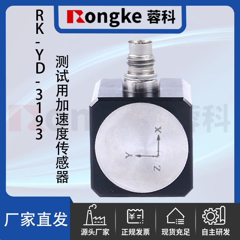 RK-YD-3193测试用加速度传感器:特点:● 微型轻量、微型1/4-28四芯插座输出● X、Y、Z 三向测量● 频响宽10mV/g,可选20-100mV/g, ±500 g...
