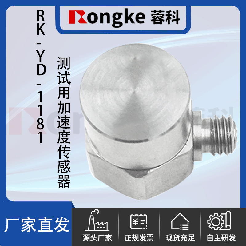 RK--YD-1181测试用加速度传感器 特点:IEPE型,小型轻量频率范围宽,动态范围宽性价比好的通用型加速度计侧端输出100mV/g, 1~10000 Hz , ±50g...