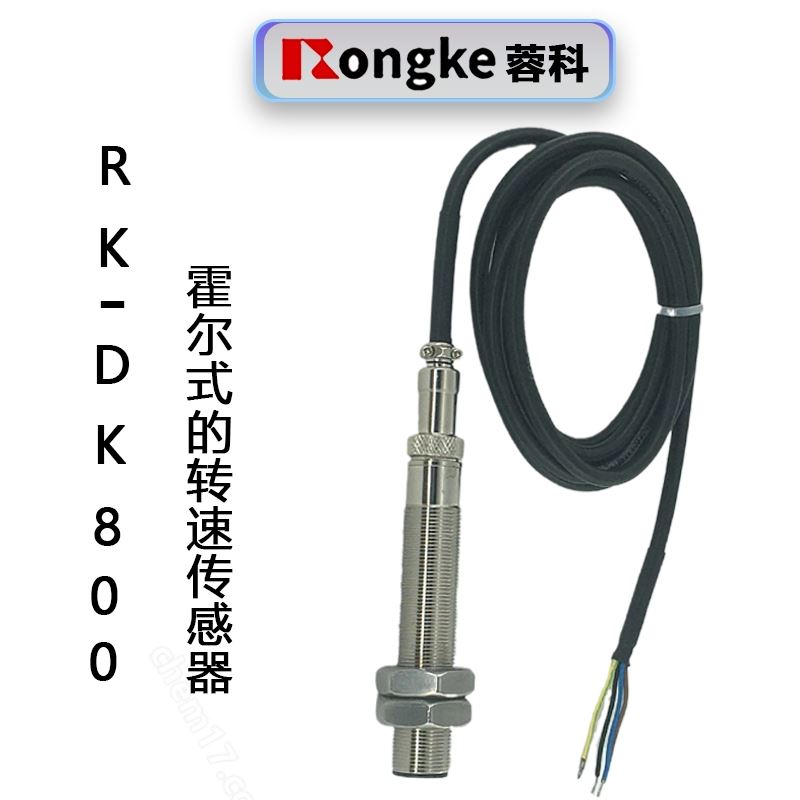 RK-DK800霍尔转速传感器由磁敏电阻作感应元件,是一种新型的转速传感器。当被测体上带有凸起(或凹陷)的磁性或导磁材料,随着被测物体转动时,传感器输出与旋转频率相关的脉冲信号,达到测速或位移检测的发讯目的。